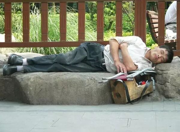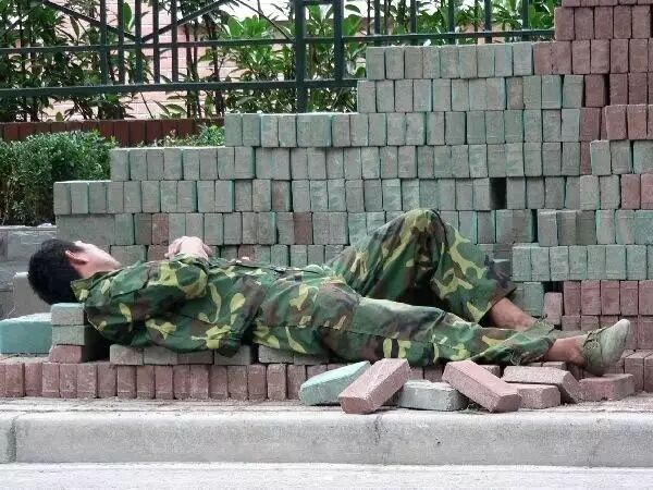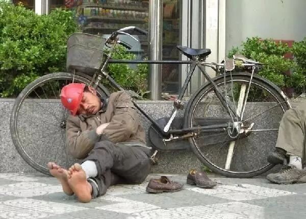这位修马路的农工以砖作枕,以砖作床就这样呼呼大睡起来。
