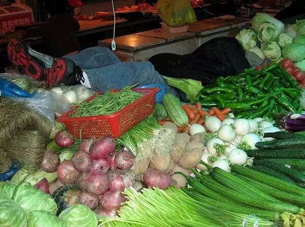 菜市场摊贩酣睡在自己摊位上,下午还要继续卖菜。