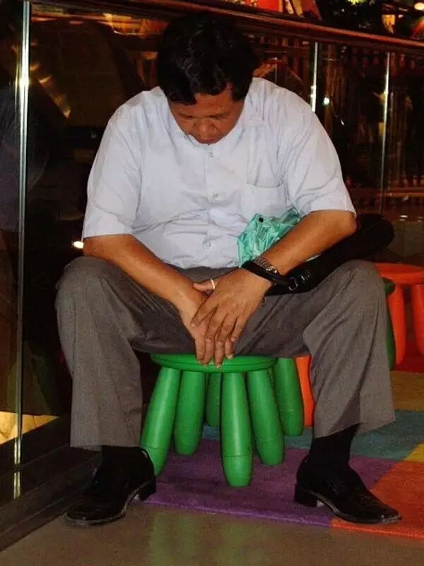 这位出来办事的先生就坐在这商场小凳子上打起了盹。