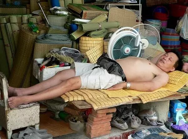 卖凉席的老板戴着收钱的腰包,躺在自己临时搭建的小床上暇意地酣然入睡。