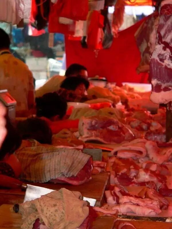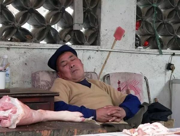 菜市场猪肉摊贩累的不行,就这样酣睡在自己的摊位上。