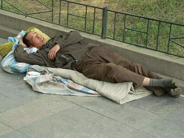 街边流浪汉,酣然入睡。