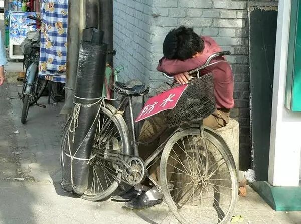 做房屋补漏生意的农民工,趴在自行车上睡着了。