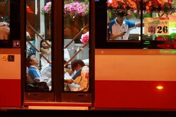 公交车里疲惫酣睡的乘客。