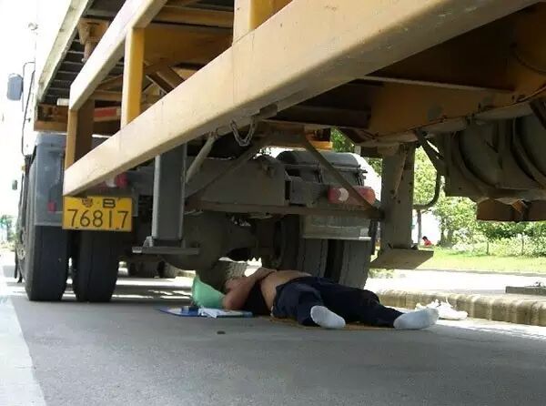 躺在自己货车下休息的长途货车司机。