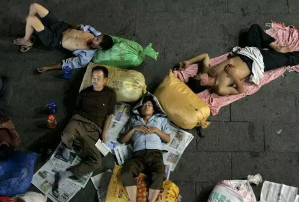 火车站外广场上打地铺酣睡的农民工。