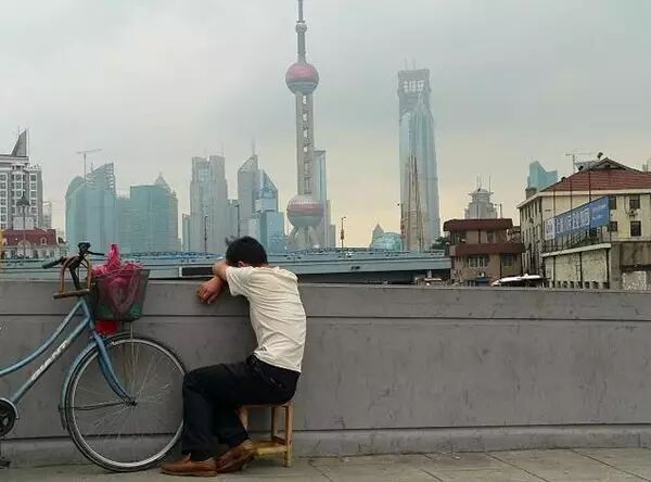 上海外滩陆家嘴,这位师傅靠着石栏入睡了。