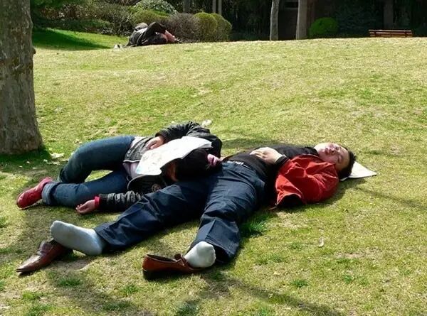 在公园的草坪上,这两位睡的是那么肆无忌惮。