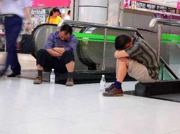 坐在商场电梯口打盹的人,他们一般是外来务工人员,商场里有空调可以简单的睡一下。