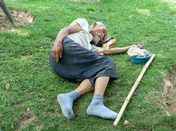 这老人不知是不是乞丐,把鞋子脱下当枕头在这块草地上呼呼的睡着了。