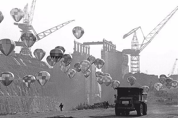 1997年11月7日,即将要截流合龙的三峡工地披上了豪华盛装。贺延光/摄。