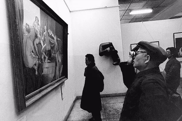 1989年2月10日,中国美术馆的"现代艺术展"引起社会广泛争议。一位老者在一裸体油画作品前,举起望远镜仔细观赏。贺延光/摄。