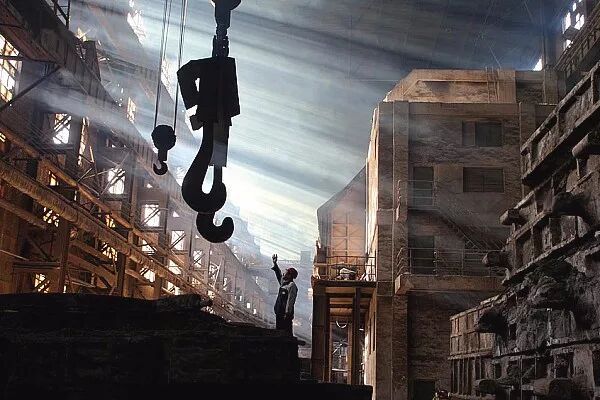 2008年10月27日,沈阳,一位工人正在车间里指挥吊车作业。贺延光/摄。