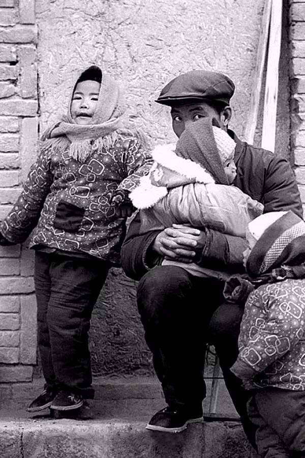 1992年2月17日,陕西陇县,一位农民和他的三个孩子,怀中抱着的是刚出生的第三个男孩。贺延光/摄。