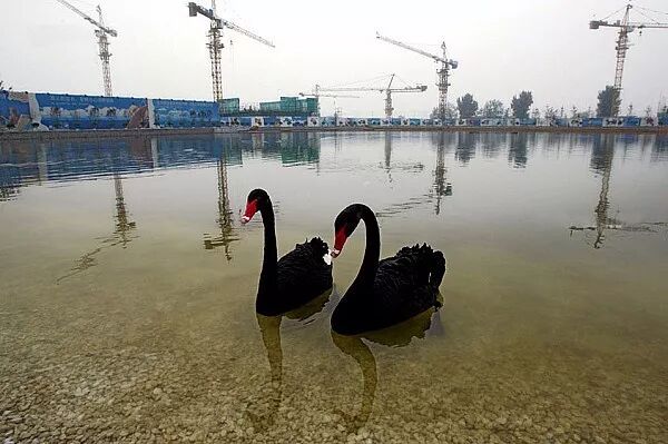 2004年7月7日,北京城南五环路外一处楼盘的人造湖中,两只人工喂养的黑天鹅正在水中游弋。贺延光/摄。