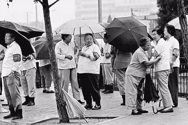 1990年9月5日,北京,第11届亚运动会即将在北京开幕,东直门地区一群退休老人正准备上街执勤巡查。贺延光/摄。