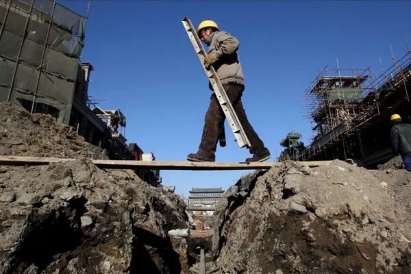 2008年1月1日,参加北京前门大街修缮改造工程的施工人员。