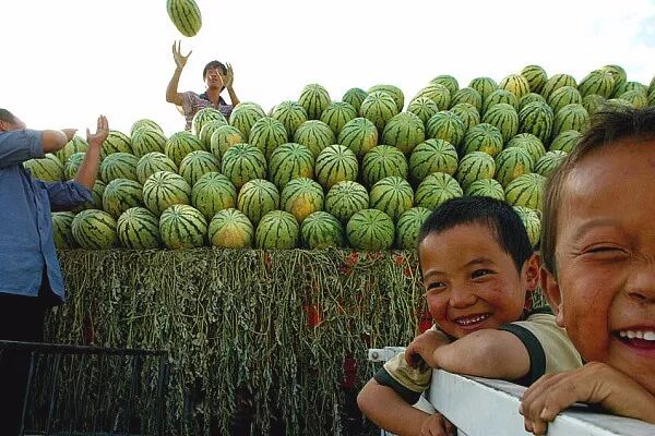 2002年8月29日,宁夏同心县南关村,几位农民正在采摘西瓜连夜运往西安。贺延光/摄。