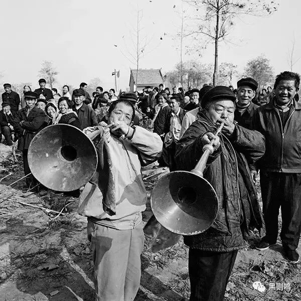 2005年11月,河南省兰考县固阳镇雷寨村三元宫庙会,庙会上两位吹大喇叭的农民艺人。胡力/摄。