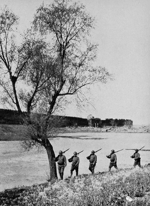 1938年3月25日,安徽省定远县城外,沿河边巡逻的日军增田部队士兵。