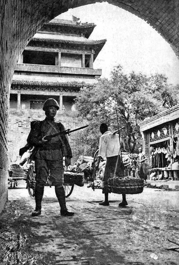 1938年7月7日,卢沟桥事变一周年,北京广安门前站岗的日军哨兵。