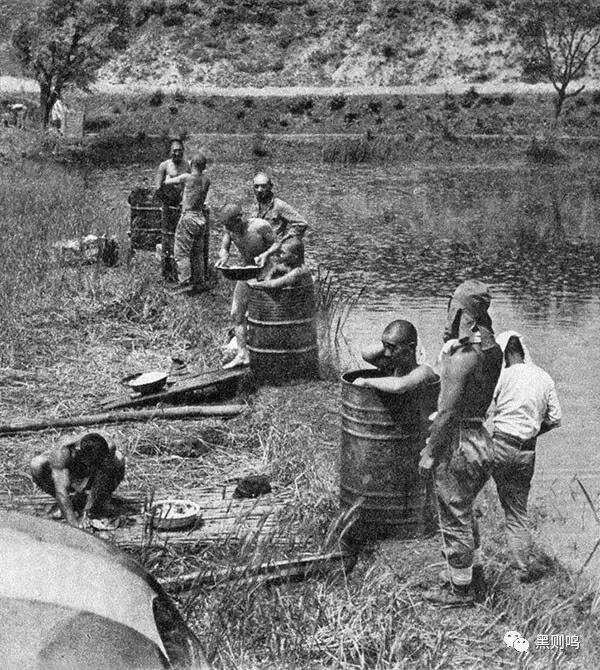 1939年6月,湖北战线,湖边冲凉的日军士兵。
