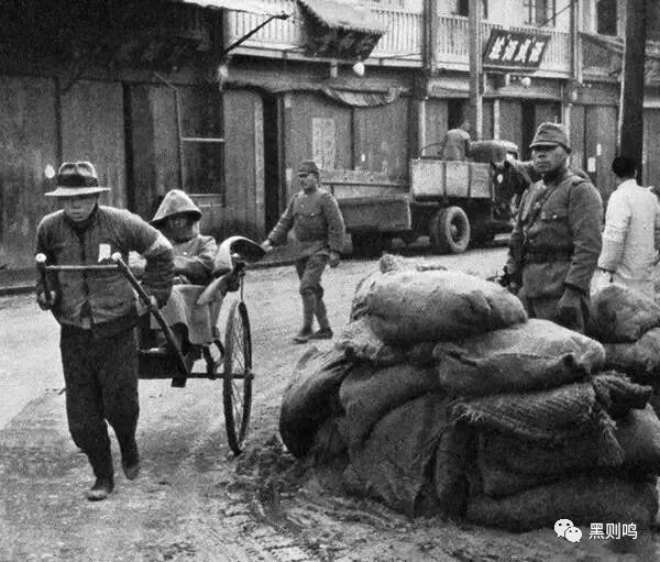 1938年2月,安徽芜湖,站岗的日军和拉车的人力车夫。