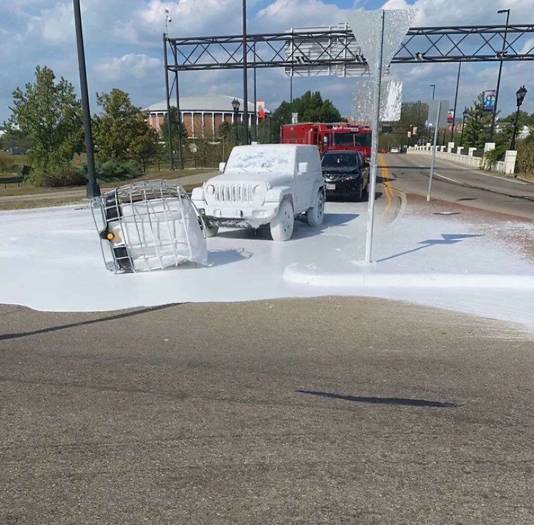 刚买的吉普,追上了油漆车,你可以享受一次免费喷漆了。