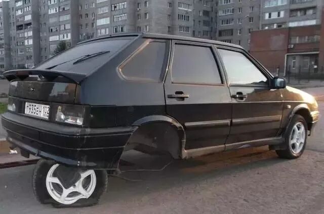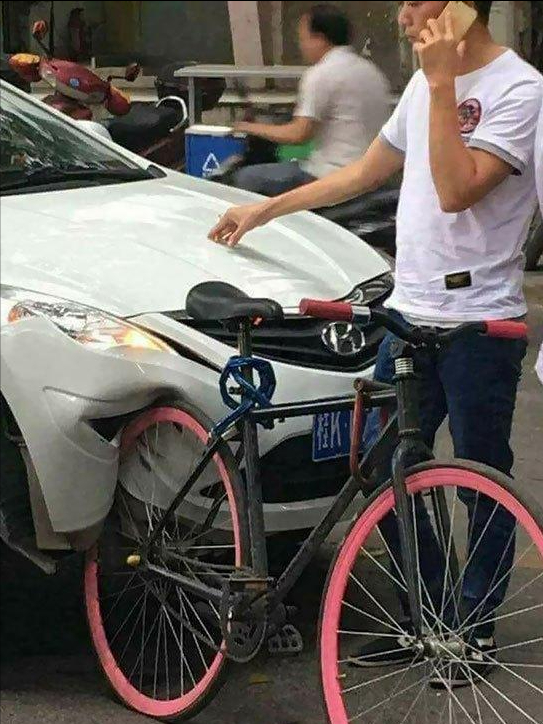 老婆,完犊子,汽车追尾我的自行车,汽车被干报废了。