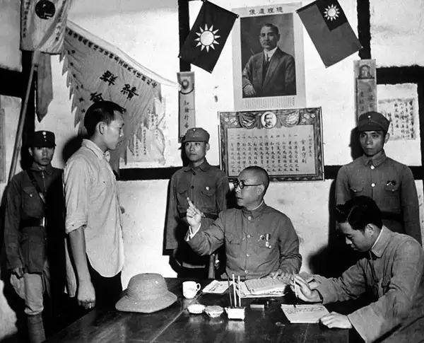 1941年,简阳县龙泉驿(1960年成为成都龙泉驿区),当地政府官员在审理一男子偷窃案件。卡尔·迈登斯/摄。