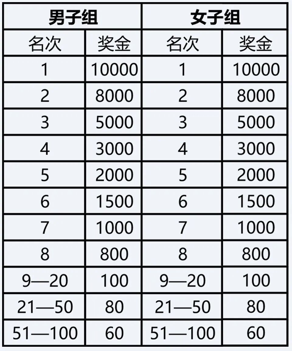 设枣庄籍运动员奖,枣庄籍运动员按照净成绩单独排列名次。获得男、女前10名的运动员。分别获得以下奖金(币种:人民币,单位:元)