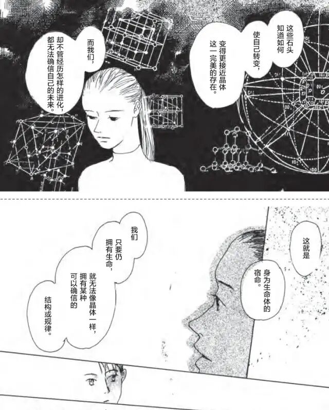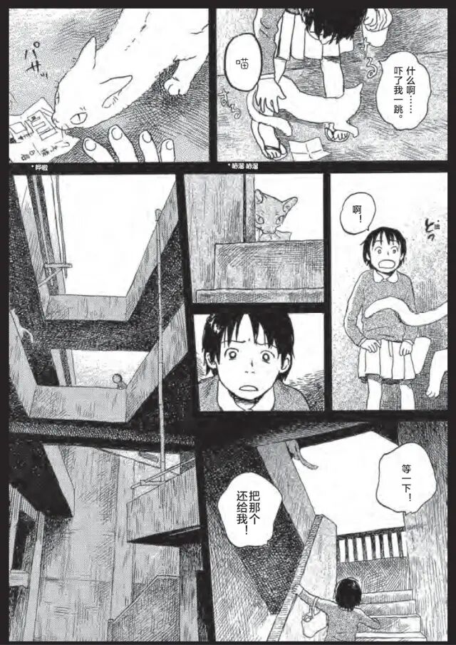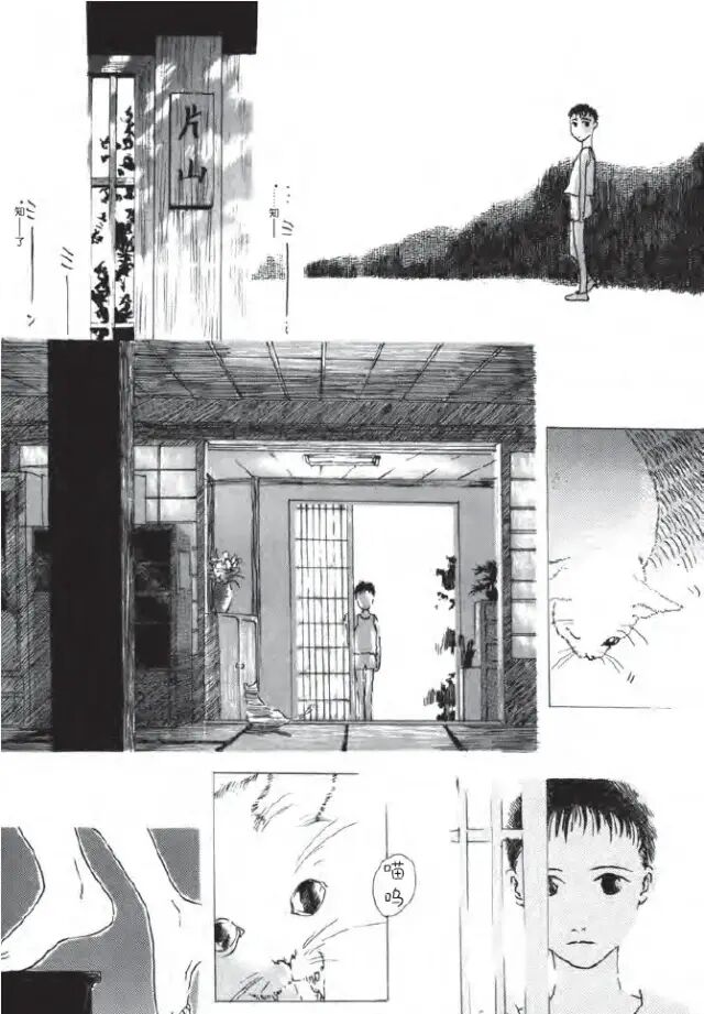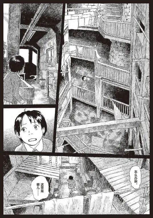 “和现在的作品相比,我的旧作看上去就像是和我很像的另一个人画的。但只要仔细回看就会发现,原来我的根源就在这里。”《海与温柔眼神》里一共收录了十八则精妙的短篇故事。内容包含了从漆原友纪使用“志摩冬青”这一笔名出版的单行本中摘录的部分绝版作品,以及两篇新作。因大多数作品的创作时间介于1992-1997年,所以观感上会和她目前被人们所熟知的风格有所差异。从分镜上来说,她彼时的作品还不具有成熟的商业漫画气息,而是充满了随性与写意,有时还颇具近年火热一时的“图像小说”的意味。不过,尽管创作时间跨度较大,但多数作品的结局往往都是哲学意味浓厚的留白之笔。最令读者欣慰的是,她并非选择以人生导师般的说教姿态呈现故事,而是只站在戏中人的角度淡然低语,而画面外的读者只需自由感受。漆原友纪在关于《迷宫猫》的创作对谈中提及过自己对集中住宅区情有独钟。在这里建筑的气息会与人类发生绝妙的相融,令人着迷。本篇作品中令主人公小绫感到畏惧的迷宫住宅区就是以著名的“军舰岛”为蓝本创作的。漆原友纪童年所处的20世纪70年代,是日本产业政策调整和经济转型的“大起大落”时期。这一阶段的工业化成果让日本一跃成为当时资本主义世界的第二大经济体,而后又因为第一次石油危机的爆发,让日本出现了物价飙升和失业率高涨并存的“滞胀”局面。普遍颓废的经济氛围,让社会生活蒙上了一层哀怨无奈的阴影。就是在这一时期,军舰岛的住宅区开始随社会经济的变动大势走向颓败。