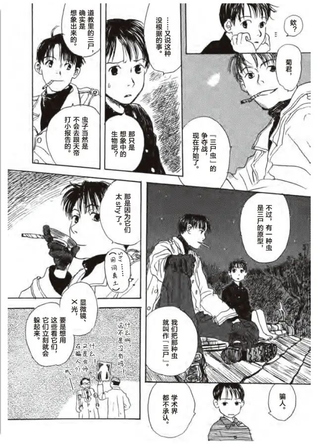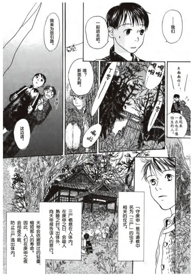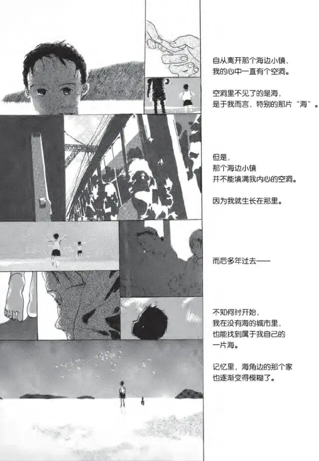 比如在《虫师》-<蓝色音乐>中,受疳虫影响的枣小姐对夜风中的声音极其敏感:早期的《虫师》是以我们生活的世界为舞台、以真实的历史文化为基石的作品,因此设定上更加贴近现实。比如在《虫师》-<屋顶上的宴会>里提到,道教传说中人们为了防止“三尸虫”在庚申时刻从体内飞出,会彻夜不眠举行仪式;还提到现代医学界不承认三尸虫的存在,是因为它们会敏锐地躲避X光和显微镜等科学手段的探查。而《蟲师》的舞台,则是地点、时代都不明的某地。漆原友纪认为,只有在这样的舞台上,才能更加自由地展现想象中的生物——“蟲”的魅力。因此,虽说是《蟲师》的原型,她更希望大家能把《虫师》当作独立的故事阅读,尽情感受这两个不会重合的世界。尽管她的作品中出现的画面总是展现出一种需经细微观察后才有底气描绘的意味,但漆原友纪本人却并未专程进行过特殊的参考,而是一边回想着至今为止体验过的山林风物,一边用恬淡的笔触将脑海中的画面复现在故事中,初心可见一斑。从漆原友纪成为“漆原友纪”之前,有《蟲师》的原型作品《虫师》,有短至四页的细腻留白作品《小景杂账》,还有技法纯熟、展现出大师风貌的《在岬角下巴士的人》。《海与温柔眼神》继承了漆原友纪初心所包含的禅意美学和带有物哀气质的平常心。这种平常心不等同于面对生活中的种种无力反抗,而是在于解除自我的压力枷锁从而进入生命的真实、平和的意义。漆原友纪作品中呈现的美学是超越生命活动的体现,既能直观平常,又能超越平常,结合物哀的复杂情感,为你我珍藏一份值得被收纳于心的温柔。《海与温柔眼神》
