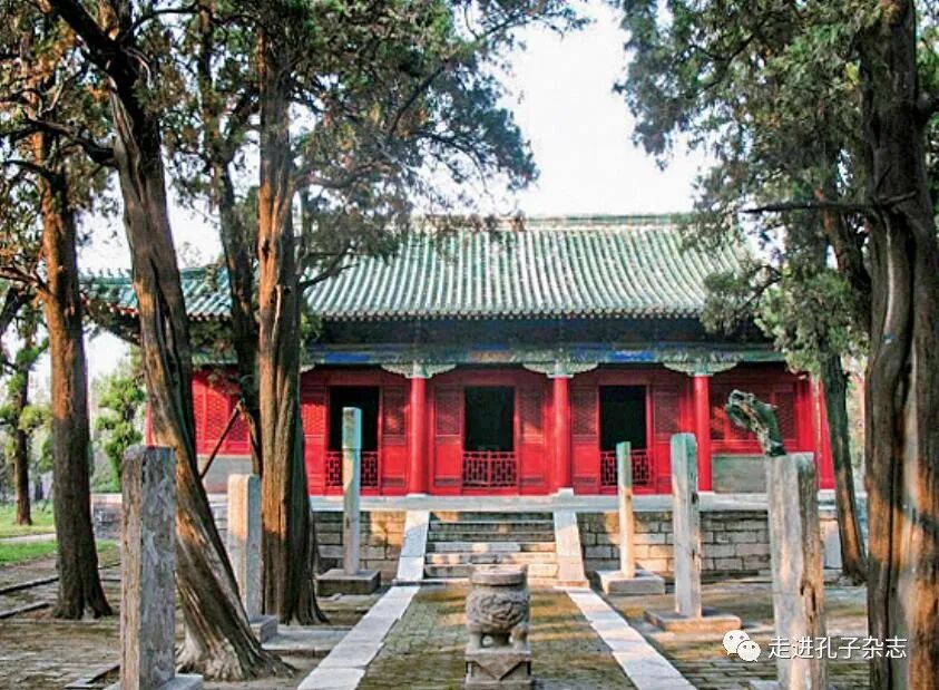 传说生长在孔子墓上的楷树为其弟子子贡所植。子贡从老家奔先师之丧时,将一棵从卫国捧来的楷树苗栽于其师墓旁,后成大树。清康熙年间,子贡所植楷树遭雷火焚灭,后人遂将枯干图像刻于石上,碑名“子貢手植楷”。又于石上建亭存碑,亭名“楷亭”(见下图),图中亭内为子贡手植楷树残留之物。历代的人们对子贡崇敬仰慕,所以那碑上“貢”字被无数虔诚手指抚摸出深深印迹。仔细看看,那“植”右侧还少写一横,不知何故。