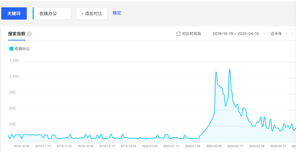 百度指数搜索曲线走势则更为直观,人们对在线办公软件的关注与需求,在短暂的井喷之后,开始明显回落。