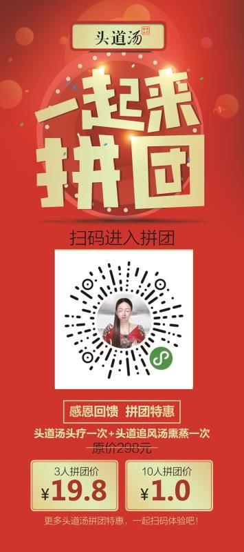 我们这次活动主推的内容,就是“头道汤头疗一次+头道追风汤熏蒸一次”,原价298元,现在拼团价19.8元,3人成团;而10人成团,拼团价只需1元。