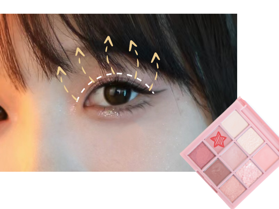 肿眼泡或内双的姐妹可以往外再多晕染一点,还是注意少量往外晕,保持深色-较深-较浅-浅的颜色过度就行(也就是避免出现边界线)。