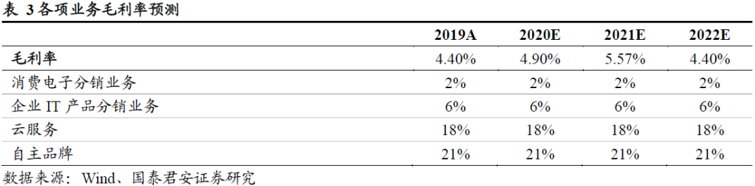 主营业务:2020年,公司重点发展云服务和自主品牌业务,预计收入继续保持高速增长,分销业务保持低速增长,各项业务毛利保持稳定。