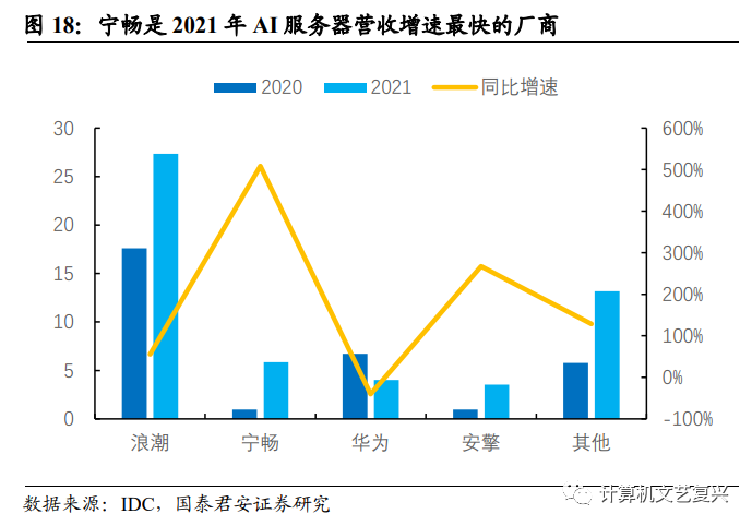 浪潮信息占据我国AI加速服务器半壁江山,宁畅份额快速提升。行业格局方面,AI加速服务器整体行业集中度较高,2021年前五大厂商市占率合计高达83.1%,其中浪潮信息市占率高达50.7%,占据半壁江山。与2018年相比,中科曙光及戴尔市占率掉出行业前五,初创企业宁畅和安擎进入行业前五。定制化服务器独角兽企业北京宁畅在2020年公司创立首年便以约1亿美元销售额以及3%市场份额位居行业第四,2021年宁畅的AI加速服务器营收提高至5.8亿美元,市场份额大幅提高至10.8%,排名跃居行业第二,实现了快速发展,宁畅多位高管及核心骨干来自于中科曙光等头部服务器厂商,具备极深的行业积淀,未来市占率有望继续提高。