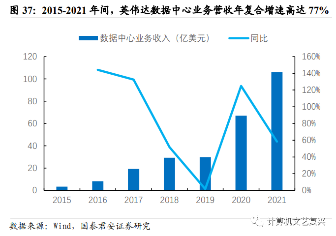 英伟达占据国内80%以上AI加速卡市场,海光产品已经实现商业化销售。英伟达和AMD是目前全球GPGPU的领军企业,二者合计获取了目前GPGPU绝大部分市场份额,其中英伟达的数据中心业务收入在2015年仅为3.4亿美元,至2021年营收已经达到106.1亿美元,2015-2021年间年复合增速高达77.4%。在中国市场上,根据IDC数据,2021年英伟达占据我国加速卡80%以上市场份额,处于市场领先地位;国产企业中,海光、华为海思、寒武纪等都是国产协处理器研发的主要企业,公司的GPGPU产品深算一号在2021年已经实现商业化应用,首年实现销售额2.39亿元,出货量1.24万片,成为最早实现商业化销售的国产GPGPU芯片之一。