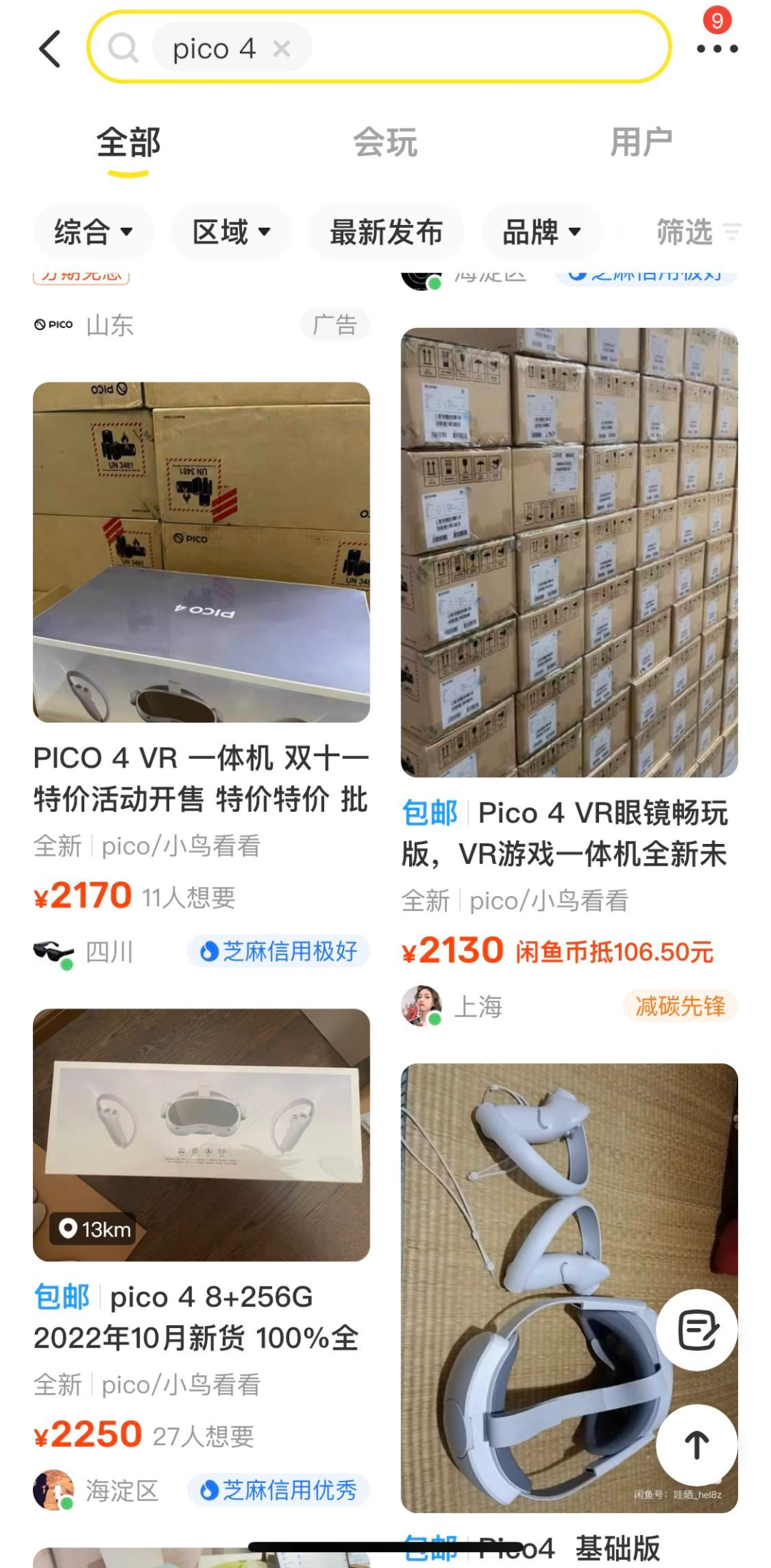 与此同时,在二手交易平台闲鱼上,大量的Pico 4正在被转卖。这些Pico 4大多打着“全新”、“未拆封”的标题,有些卖家还会上传库存图片,以证明“全新”的可靠性。显然,这些卖家并不是个人卖家,而是Pico的经销商。