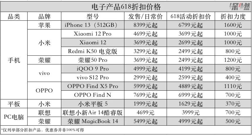 618,可以说是2022年上半年,电子产品厂商们最后的希望。电子产品“三大件”手机、平板和电脑,以及可穿戴设备包括耳机、手表和手环,背后的厂商们,为了抓住这个618,使出了浑身解数。新品迭代速度快、库存压力大的手机厂商们,产品补贴力度不小。曾给用户留下“很少打折和降价”印象的苹果,近两年也成了电商大促的常客。今年618期间,京东平台,iPhone 13补贴券达1001元,而天猫平台,iPhone 13(512GB)叠加多重满减优惠后,相较首发价最高优惠达1600元。线上起家的小米,更是不会错过618。据深燃观察,今年618,京东平台小米多款手机的价格下降了1000元。比如,小米 12的日常价为3699元起,消费券后价格为2699元起。几乎所有的主流手机厂商都针对618大促推出了折扣活动,即便有些优惠券是有概率的,并非一定可得。在OPPO商城中,OPPO Find X5 Pro最高优惠1110元,还赠送充电宝;OPPO的折叠屏旗舰OPPO Find N,京东618当天8+256GB的版本,相比首发价格优惠了700块;vivo 旗下iQOO 9 Pro在京东平台最高可减800元;荣耀 60在官方商城价格可降400元。高端旗舰机的定价更高,降价幅度也更大。不过,潮电智库董事长孙燕飚对深燃分析称,上半年,手机市场真正销量下滑的,是在2000元-5000元的档位,这也是厂商们竞争最激烈的价格区间。平板和PC电脑市场也是如此。在京东上,小米平板用券后价格可降370元,荣耀5月刚推出的新品笔记本电脑MagicBook 14则享受限时至高优惠500元。可穿戴设备中,AirPods第三代耳机也从发售价1399元下降201元至1198元。今年上半年,受疫情影响,消费意愿下降,很多用户觉得自己没必要换机,电子产品也不像日常消费品一样需要囤货。今年618,林虹想和朋友一起凑优惠折扣价格,但找了一圈好友却发现,朋友们几乎都没关注今年的618活动,消费心态多是“非必要不购买,不买立省百分百”。在618活动初期,厂商们的预售数据表现并不算好。国泰君安社服商贸团队首席分析师刘越男统计的天猫平台618预售(5月26日20点-5月31日21点)数据跟踪显示,2022年的618预售销售额同比下滑14.8%,预售销量同比下滑27.1%,整体数据呈现下降趋势。其中,数码产品品类预售销售额同比下降了46.6%,销量同比下降了39%。不过,在第一波厂商大促销后,电子产品消费市场的情况得到一定改善。据魔镜市场情报数据显示,从各品牌2022年天猫“618”第一波活动销量情况来看,手机品类总计销量较去年有所上涨,为154.95万部,同比上涨了25.47%。从销售额来看,苹果为54.64亿元,同比上升47.54%,份额为79.5%,同比增长10.42%,而整体安卓端销售额为14.09亿元,同比下降14.99%,主要因均价下降导致。而根据各厂商目前已经公布的618数据,在某些维度上,同比也有一定增长。其中,荣耀称618首日4分钟销量超过了去年618首日全天;OPPO称其618首日1小时的销售额超过了去年618首日全天;vivo的蓝牙耳机在5月31日活动开启后4个小时,增长了580%;据小米披露,截至6月11日22:10,小米618全渠道支付金额达到102亿,其中,小米之家销售额同比增长47%,手机销量同比增长29%。618是上半年重要的节点,如果销量达不到预期,意味着去库存的压力可能将增大,并将销售压力将传导给下半年,进一步影响全年的销售业绩。尽管目前618活动还未落幕,今年是否能超过去年还没有定论,但各家的行动已经证明,没有谁想错过这个大促节点。![]()