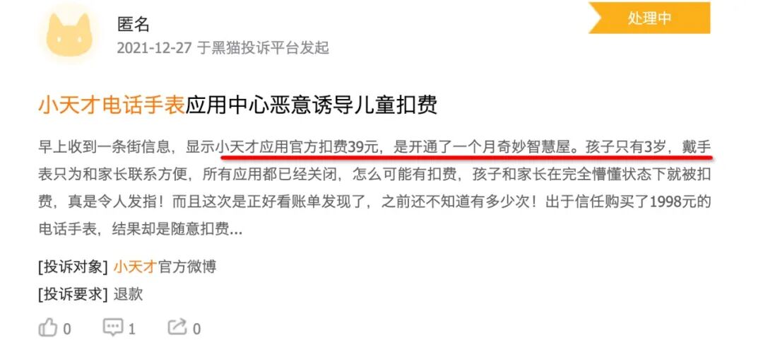 而在今年,小天才的内置应用也暴露出越来越多的问题。最近,小天才产品被不少家长投诉“存在诱导消费”、“儿童不宜内容”等,虽然品牌方提出了下架产品等整改措施,但质疑声仍不绝于耳。在黑猫投诉平台上,近一年来涉及小天才电话手表的投诉多达276条,其中多条投诉原因为“无故扣费”“诱导乱消费”等。