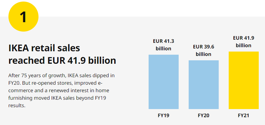2020年9月1日至2021年8月31日止12个月,宜家总销售额达到创纪录的419亿欧元。而宜家全球餐饮收入占到总营收的8%