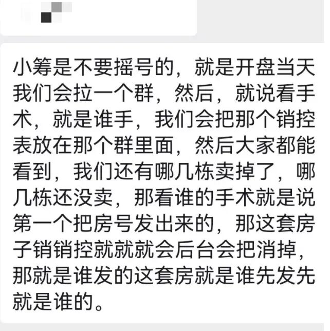 “基本上我们会到时候会编辑好一段文字发给客户,客户加上想要的房号,发到群里,第一个把房号发出来的,销控就在后台会把房源消掉,先到先得。”陈广兰解释说。