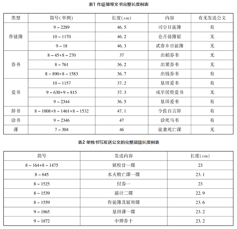 里耶秦简中有大量物资出入付受券书,这些券书由诸官或其他机构送至县廷时也需要附以单独书写的发送公文。简9-1872载“钱二千二百卌四以稟徒隶夏衣,今为出中辨券十上”,该简是少内向县廷呈送出钱所产生的十枚中辨券的发送公文,十枚券书单独书写于其他简牍。简8-1525中提到启陵乡提交县廷“付券一”,其性质与9-1872简一样都是作为券书的发送公文而单独书写的简牍。虽然里耶秦简中券书涉及的物资种类多样,涉及的出入、付受、贷买等方式也不同,但是所制成的完整券书长度皆在37厘米左右,即所谓的一尺六寸简。作为单独书写发送公文的简8-1525长度为23厘米,即为一尺简。所以,券书在被传送时,是由若干枚一尺六寸的券书附以一枚一尺长的发送公文简牍组合而成。同样的情况又见于一尺六寸长的爰书和二尺长的辞书等材料,具体数据可见以下两表: