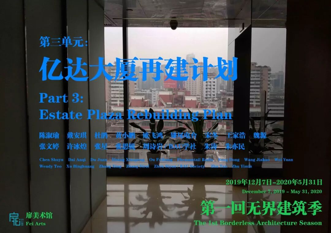 扉美术馆举办的第一回无界建筑季于2019年12月7日正式开幕,这个主题为“建筑,或者建筑”的建筑季分为三个单元进行。第一单元为“住在广州”,展出近年来出现在广州地区的有关建筑、居住以及城市空间的艺术作品与社会性艺术实践项目。第二单元为“在其他的地方”,展映由居住在其他城市的独立电影导演与建筑师拍摄的五部有关建筑与城市空间的电影。第三单元为“亿达大厦再建计划”,邀请近20位建筑师与艺术家在美术馆所在的亿达大厦的公共部分进行现场创作,这是一次将私人物业转变为城市公共空间的尝试。
