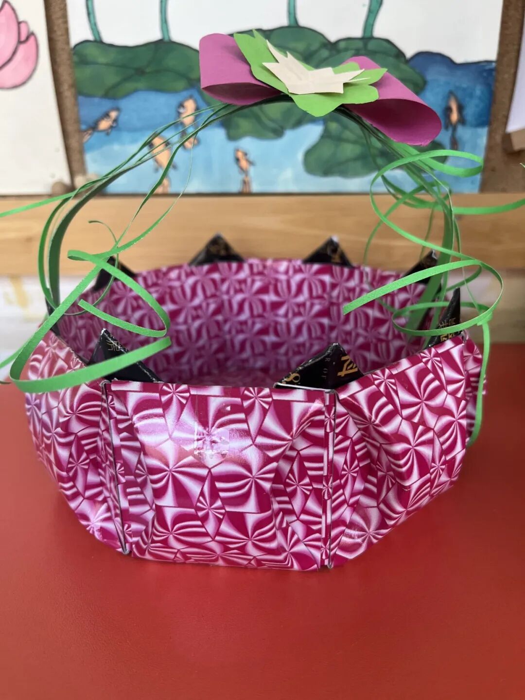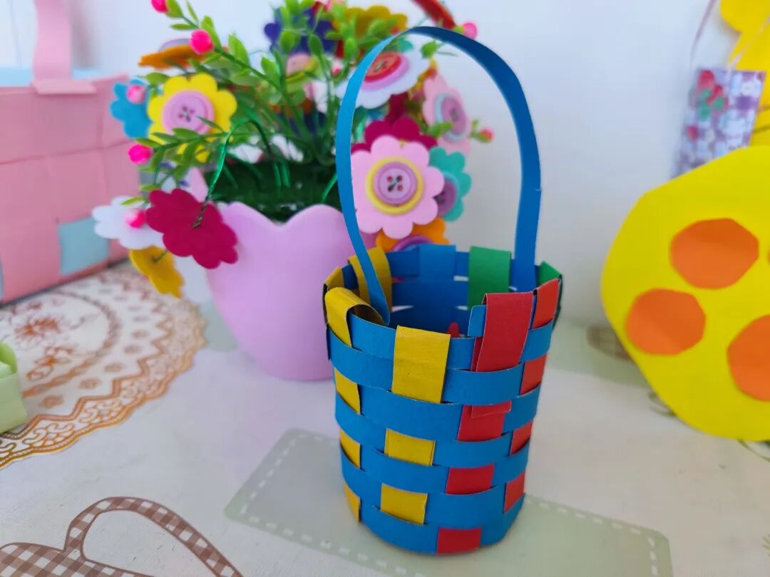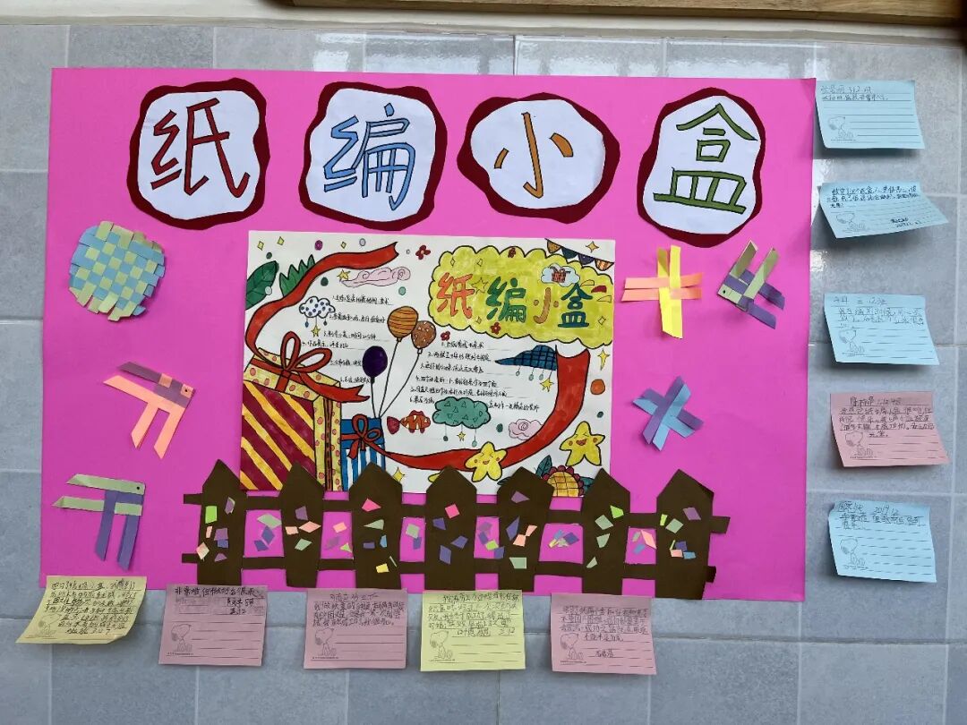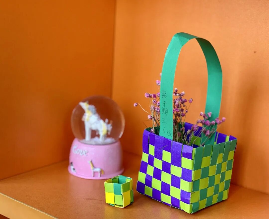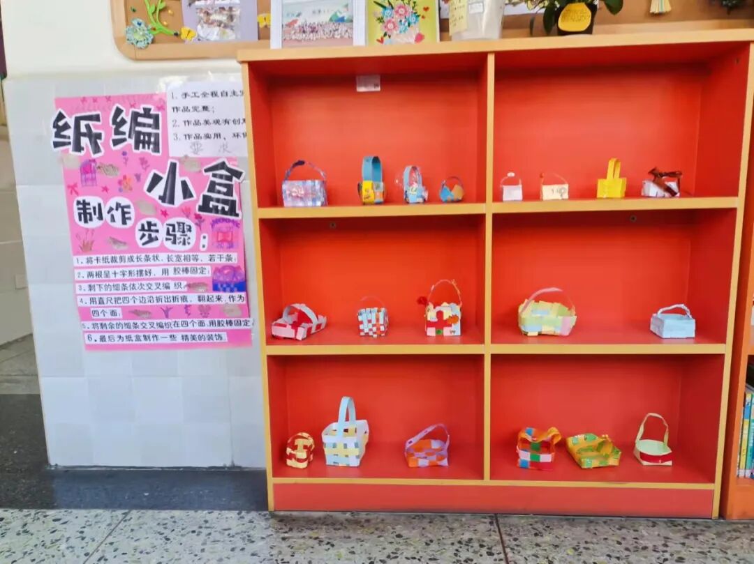 紧接着是三年级孩子的创作:纸编小盒。看来精巧的小盒可一点不简单呢!彩色纸条的串串绕绕自有它的规律,多一点耐心,多一些信心是成功的法宝。好看又实用的小纸盒你心动了吗?