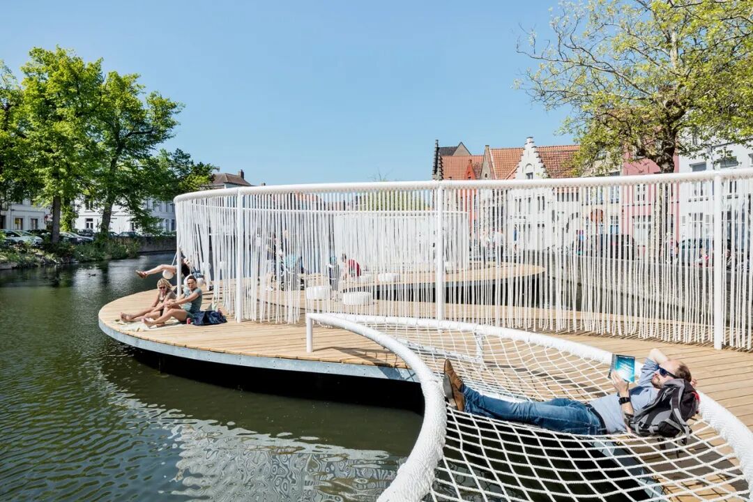 这座桥梁不仅是用于步行穿过的基础设施性城市元素,而且还敏感地与周围环境共同形成了一个公共休闲的目的地。……运用这一独特区位的社会、地理和历史背景,公共装置创造了城市空间中对于“慵懒”的不同体验。