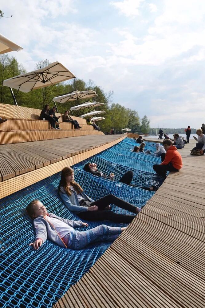 在线性路径的中间有各种不同形状和形式的空间,人们可以安静地休息。游客可以享受日光浴,斜靠在倾斜的绳索上,或者在宽阔的吊床上休息,看着天空中的云彩。此外,他们可以坐在平台边缘,欣赏静静流动的水,放松自己,阅读书籍或独自坐在圆形空间反思。也可以和悬绳玩耍。